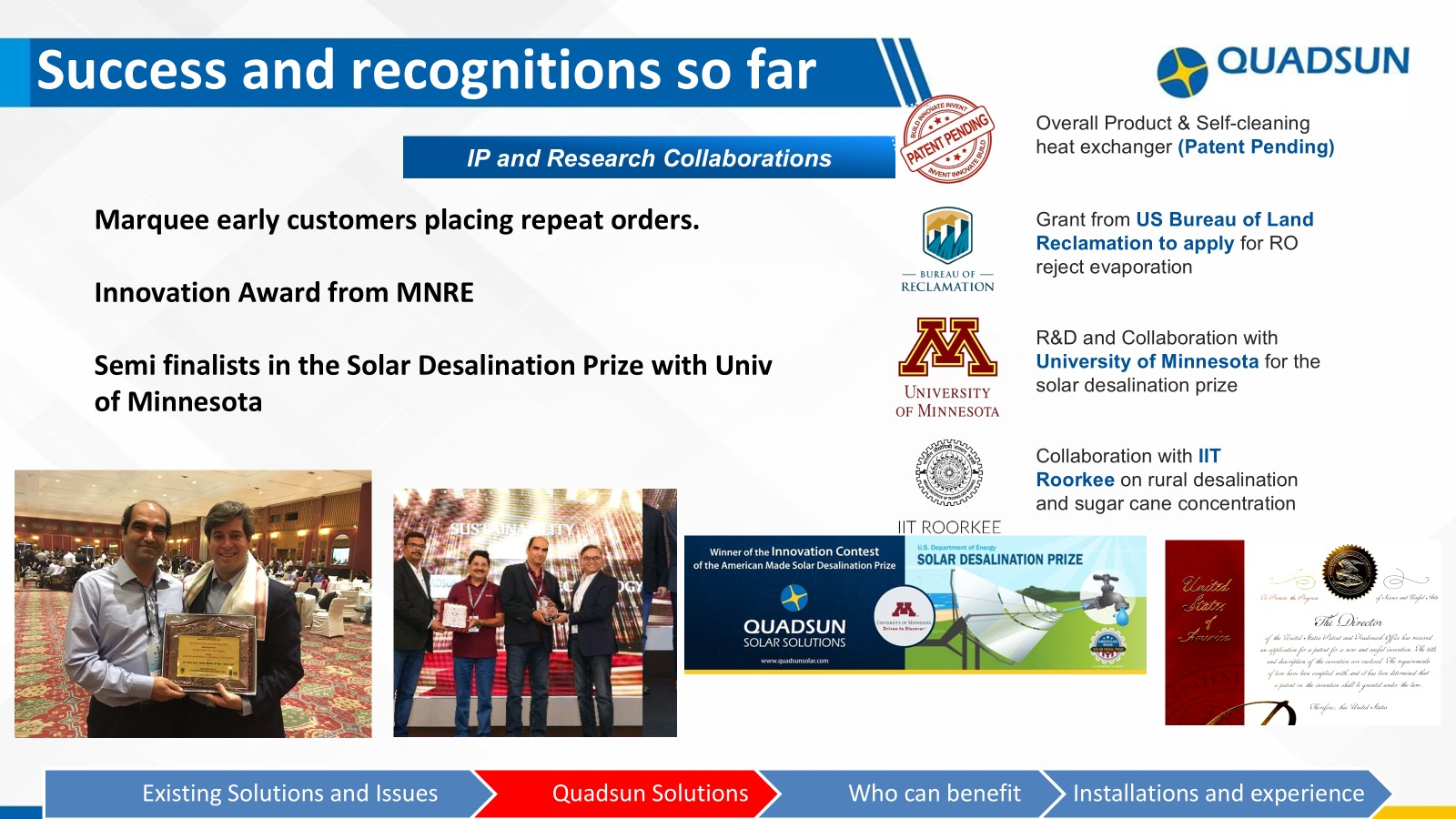 Since its inception in 2015, QUADSUN has been originating sustainable energy systems that embody several breakthroughs in optics, mechanics, thermodynamics, power electronics and tracking algorithms. Economical, reliable and highly efficient solutions tested over several thousand hours, to ensure trouble-free clean power and proven longevity of life across several applications.